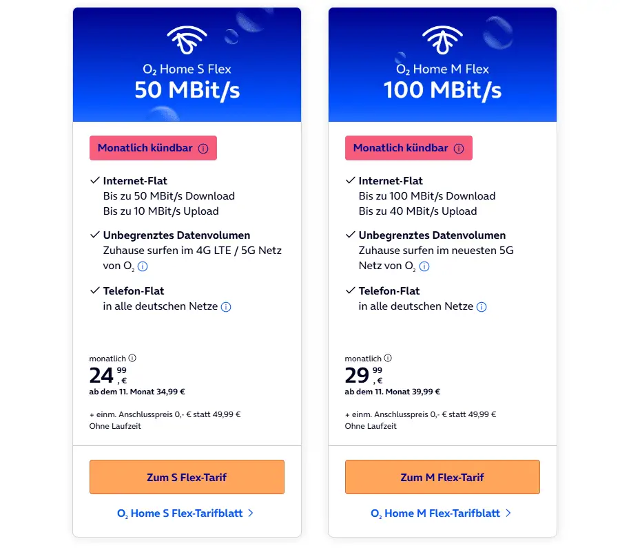 O₂ Home S | LTE | unbegrenzt | bis zu 50 Mbit/s | 24,99 € | 34,99 € | 24 Monate | 0 € (statt 49,99 €) | Nur LTE, günstiger Einstiegspreis |