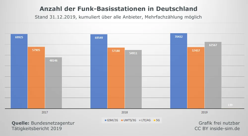 Im Vergleich zum LTE Ausbau ist der Netzausbau im 5G Bereich bisher kaum der Rede wert. In 2019 gab es 139 Stationen mit 5G Technik. Das ist nur ein Bruchteil der andere Technologien und zeigt, dass der Ausbau von 5G bisher nur am Anfang steht und die Technik noch weit von einer flächendeckenden Versorgung entfernt ist.