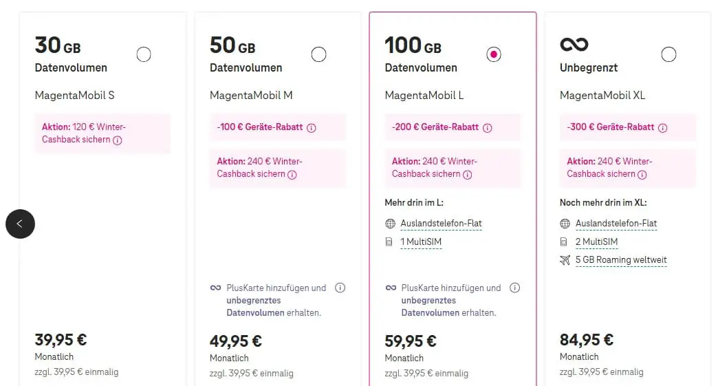 In vier Varianten sind die MagentaMobil Tarife der Telekom zu haben: MagentaMobil S, M und L. Alle sind sie mit einer SMS- und Telefon-Flatrate in alle deutschen Netze ausgestattet. Der günstigste S-Tarif kostet knapp 40 Euro pro Monat. Mit rund 85 Euro mtl. Grundgebühr ist der XL der teuerste. Nur bei Online-Bestellung kann man (aktionsweise) zumindest die ersten 12 Monate 10 Prozent Rabatt auf den Monatspreis bekommen oder sich einen Cashback sichern. Die Tarife stehen auch im Geschäftskundenbereich zur Verfügung und sind dann teilweise anders rabattiert.