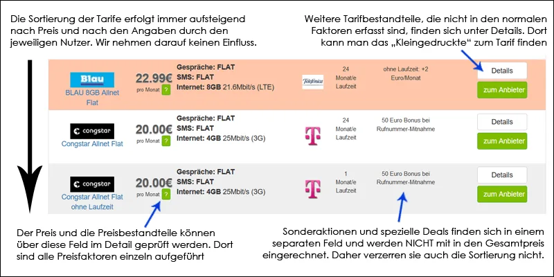 - Sonderangebote und Verknappung: Wir arbeiten mit Sonderaktion und Limitierungen nur sehr begrenzt. Aktuelle Aktionen werden in der Regel in den Besonderheiten zu den jeweiligen Tarifen und Allnet Flat mit erwähnt. Sie haben aber keinen Einfluss auf die Berechnung der Reihenfolge und der monatlichen Kosten (es sei denn sie beeinflussen längerfristige die monatliche Grundgebühr). In unserem Tarifrechner machen also vorgebliche Exklusiv-Angebote und Vorteile keine direkten Unterschied bei der Anordnung der Tarife und daher gibt es durch solche Aktion auch keine Verzerrungen im Ranking.